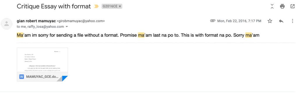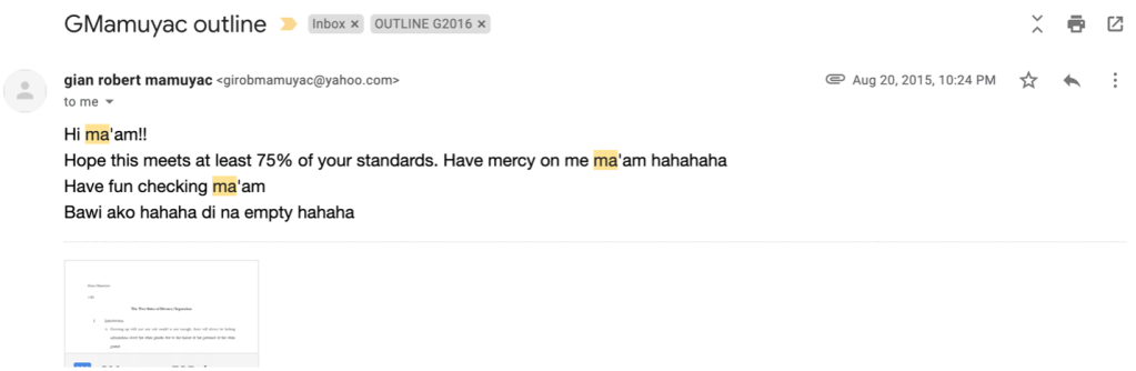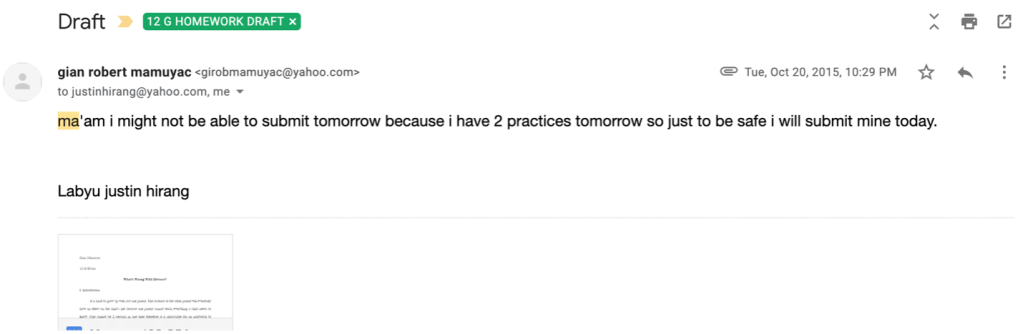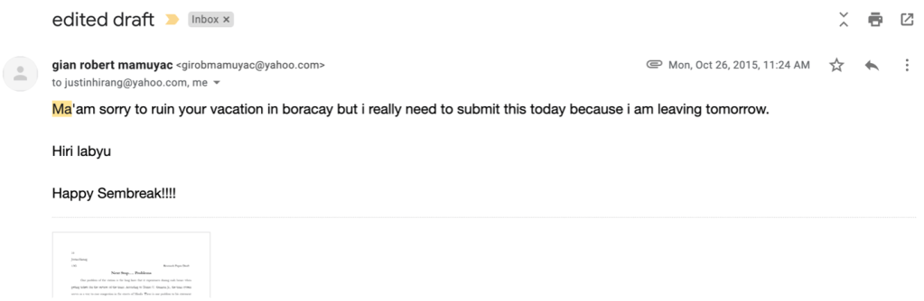 The first email he ever gave me was an email that just had his homework attached to it and I hate emails with just an attachment on it and I let him (all of them) know it. I guess that’s why his next email was